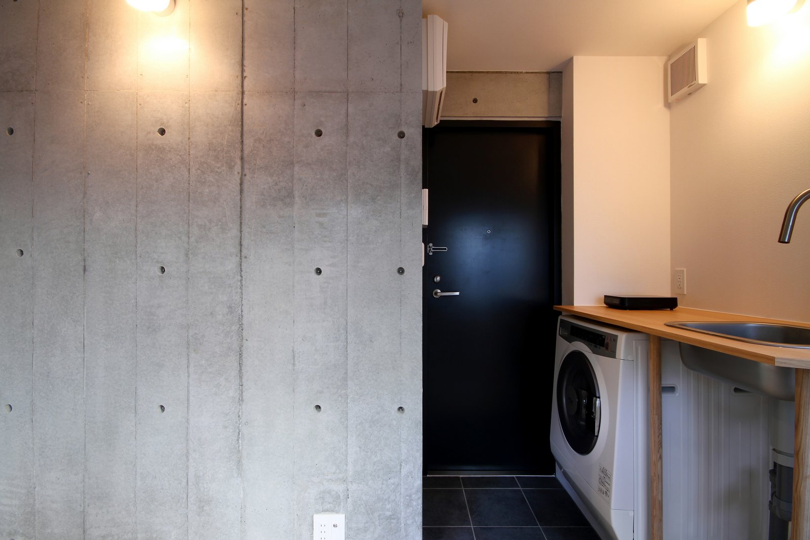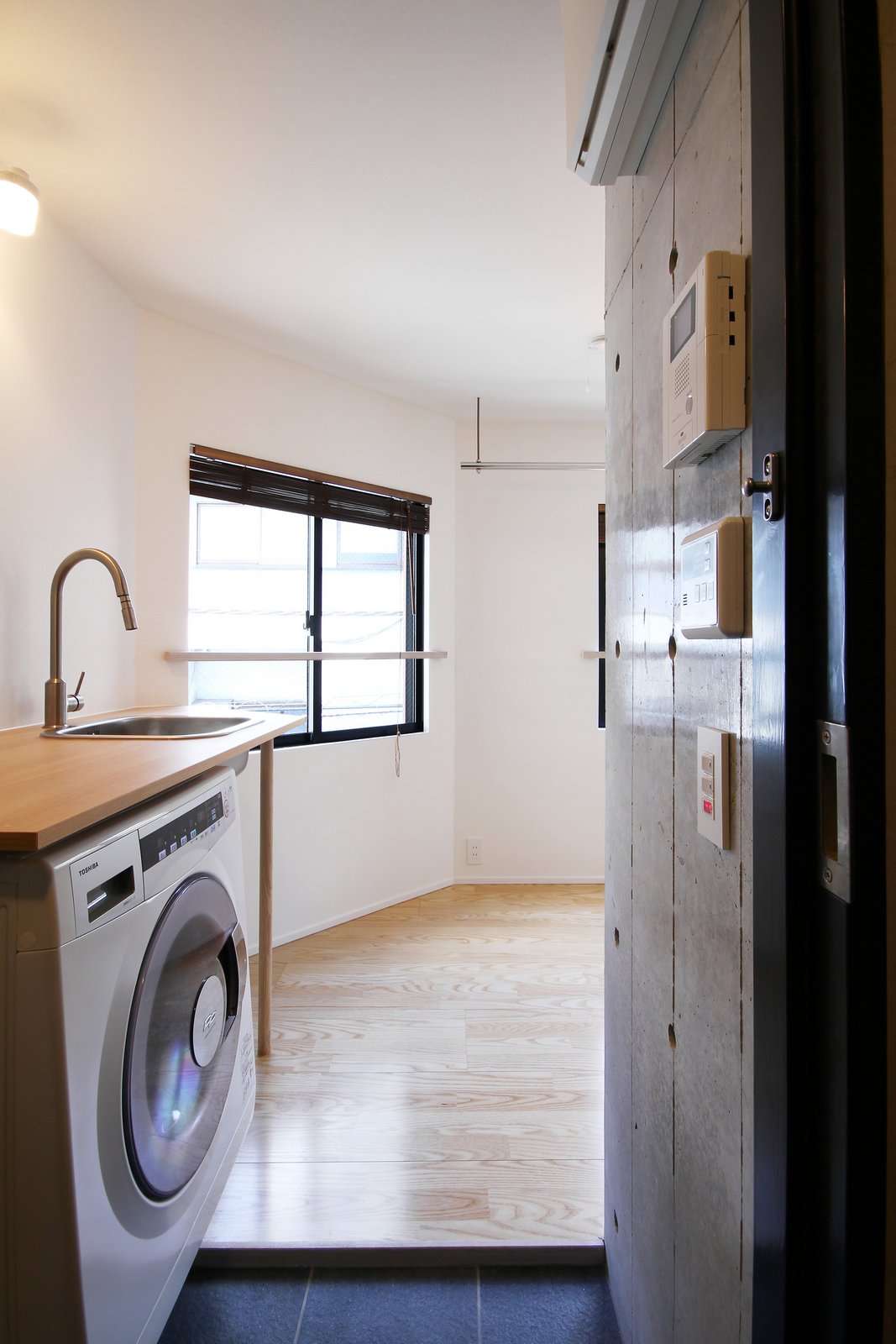 301号室。玄関から。全住戸ビルトイン洗濯乾燥機が設置されている。